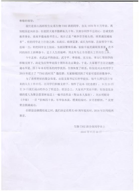 2016年9月23日至26日,生物7302班校友毕业40周年联谊会在北京海军第三招待所第一会议室召开。本次会议自2015年春刘永明组建“7302的时光”微信群陆续找回失联同学开始萌芽,到2016年暮春三月武志平倡议北京聚会,并于5月21日组织召开筹备工作会,最终在武志平、李晓婷、张宏生等人的积极筹划下,20位同学首都聚首。这漫长的过程凝聚了7302班校友多少相聚的憧憬与热情!