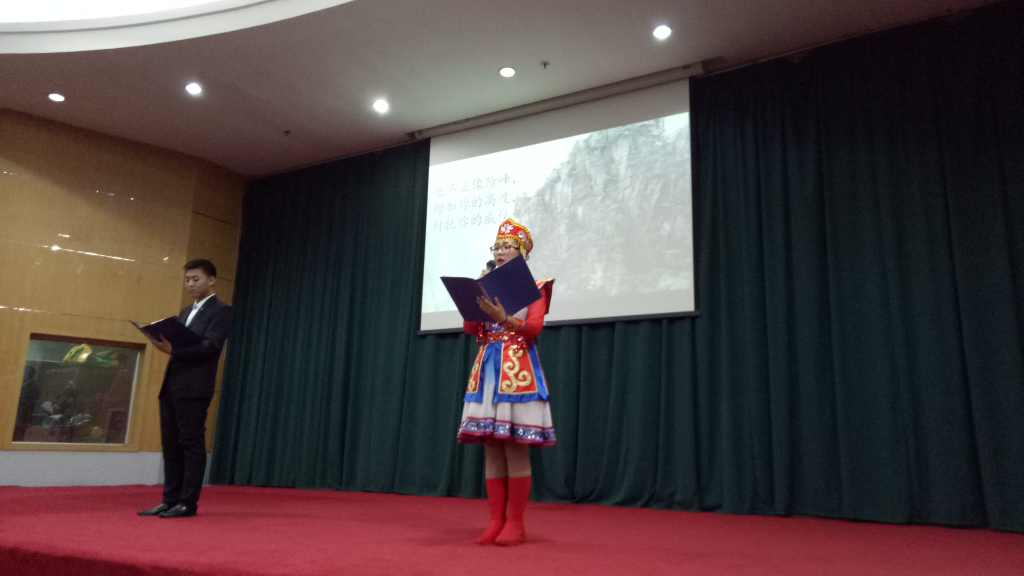 本次决赛共有10个节目入围,融合了歌曲、朗诵、相声、快板、小品等各个方面的元素,内容丰富多彩。在《God is a girl》的动感的旋律中,决赛拉开了帷幕。快板《特色校园》以铿锵顿挫的节奏,歌颂学校新改革、新气象;小品《手机综合征》情节丰富,以戏剧化的手法揭露当下社会部分人群的生活状态,发人深省;诗朗诵《致橡树》蒙汉双语沉郁而悠扬,带领我们走近热烈、诚挚而坚贞的爱情;相声《正反话》更是以诙谐幽默的语言艺术牢牢吸引了观众的目光,将比赛气氛推向高潮。精彩的节目赢得了观众的阵阵掌声,整个报告厅。经过评委们的斟酌推敲,比赛评出一等奖2名,二等奖3名,三等奖4名,由嘉宾和评委为获奖选手颁奖,并合影留念。