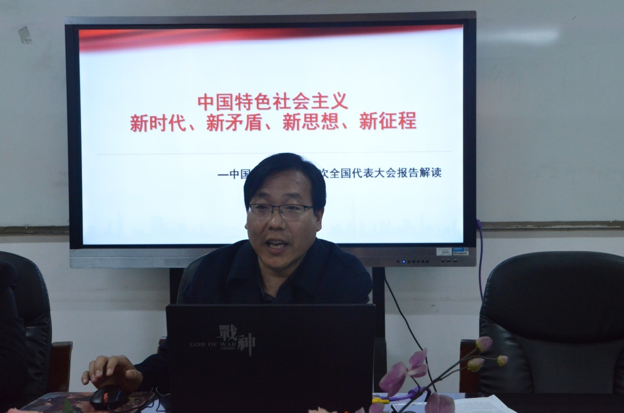 会议特别邀请了政法学院院长贾绘泽教授对十九大报告进行解读。贾院长以“中国特色社会主义新时代、新矛盾、新思想、新征程”为题,重点围绕六个方面:中国共产党的初心和使命、中国特色社会主义进入了新时代、社会主义初级阶段主要矛盾已经转变、新时代中国特色社会主义思想、开启全面建设社会主义现代化国家新征程、坚定不移推进党的建设新的伟大工程,对十九大报告进行了深入浅出的阐释与解读。